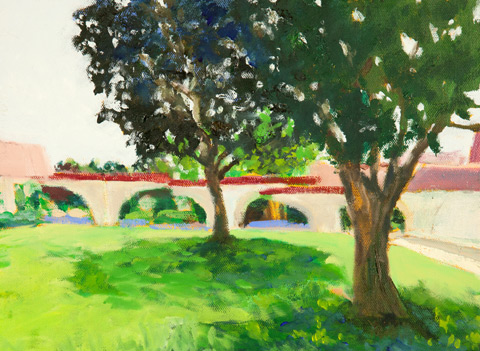 The recent watercolors of Bill Paskewitz show a strong contrast of light and shade on foreign forms of architecture. "I paint what I immediatly see when I work my compositions leaving out the details. I let the essence of the first glance challenge my perception. I think about the place, and now the memory of the first glance. The watercolor is a reminder of that experience."